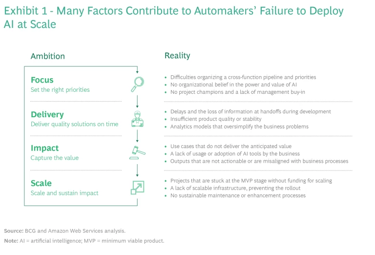 A variety of challenges contributes to the fail-to-scale pattern. (See Exhibit 1.) For example, automotive companies typically approach AI projects in a disjointed manner. They tap one team to devise the project, another to build a proof of concept (PoC), a third to launch a minimum viable product (MVP), and a fourth to scale the venture. Many AI solutions also fail because their underlying algorithms oversimplify the business problems they are intended to solve, rather than conquer the problems’ complexities.