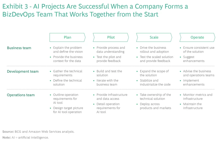 The success rate of AI projects will increase if companies clarify the responsibilities of the business, development, and operations teams from the start and the leadership of all three participates from the outset. (See Exhibit 3.) When done right, a scrum team process, where all subteams are represented in daily and weekly progress meetings, can help. This approach keeps the development team in close alignment with the business team and helps the operations team understand the choices made during the creation of the solution. It also avoids the handoffs that lead to critical gaps in successive teams’ knowledge. And this approach emphasizes creating a stable team and preventing the problems that arise when companies onboard specific skill sets at various points in the process.
