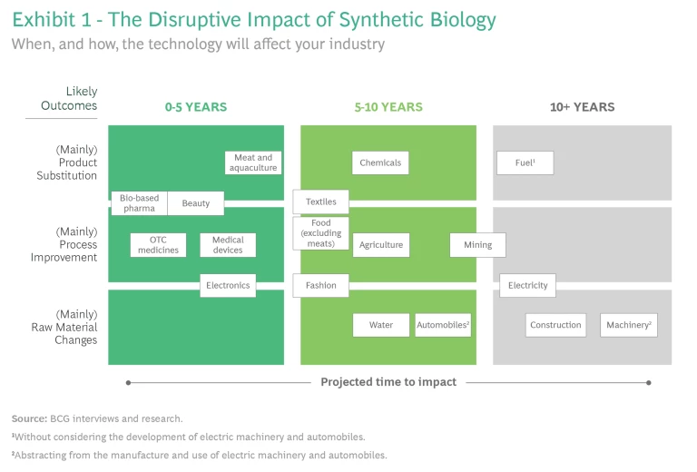 Syn-bio will soon affect many industries, although the timing of the impact on each of them will differ. Our studies show that some industries, such as health and beauty, medical devices, and electronics, will be affected immediately, while other sectors including chemicals, textiles, and water management will face cost-based competition over the next 10 years, followed by industries such as mining, electricity, and construction, as we mentioned earlier. (See Exhibit 1.)