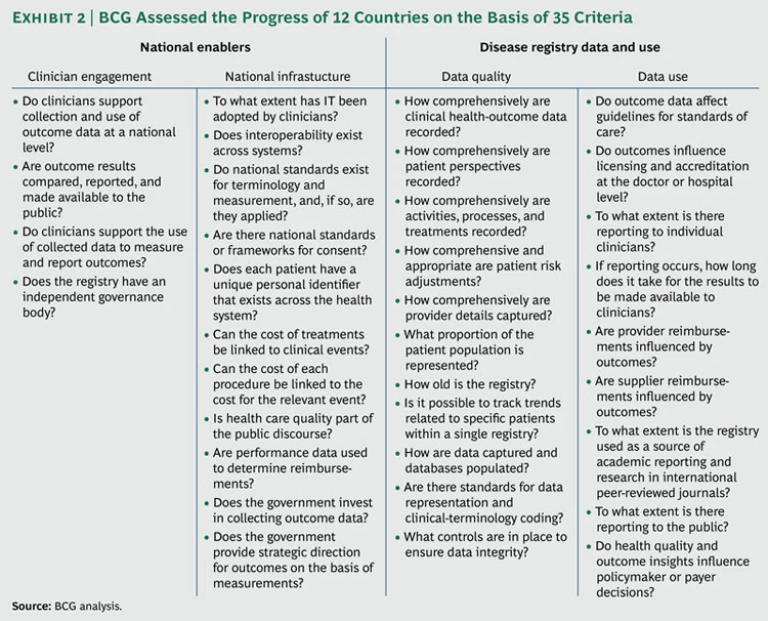 To assess each country’s progress on the two dimensions described above, local BCG teams reviewed available documented data on the national health system and the dominant registry for each of the 12 target conditions—annual reports, published academic papers, and, in many cases, internal reports provided by the registry administrators. The teams used a standardized set of descriptions to assign a numerical score—from 1 through 5—for each of the 35 assessment criteria. The scores for all 12 countries were reviewed for consistency by a global project manager and then presented for feedback to at least one topic expert per registry in each country. These external reviewers used the same criteria and grading system.