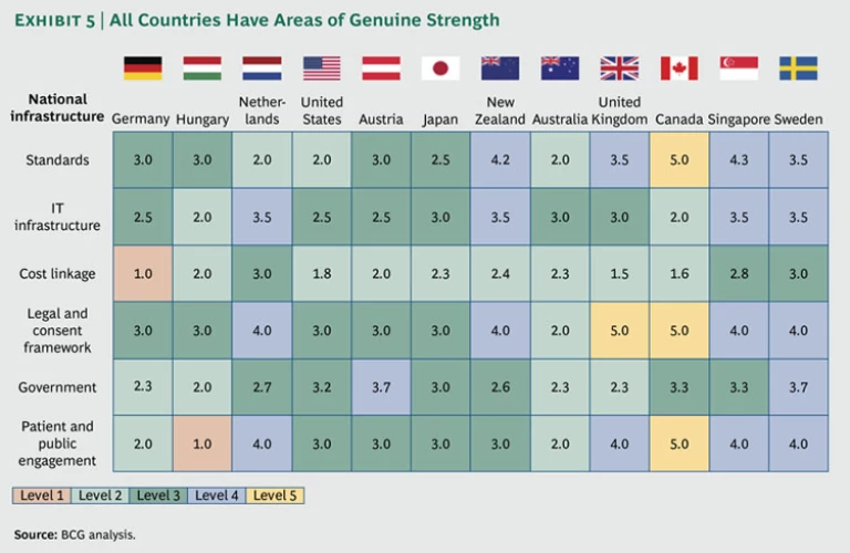 It is important to emphasize, however, that even those countries in our assessment with low average scores have some areas of genuine strength. Exhibit 5 disaggregates the scores of the 12 countries in the national-infrastructure category. It shows that the Netherlands, one of our ranking’s low overall performers, has quite a strong legal and consent framework, as well as a high-quality IT infrastructure and relatively engaged population.