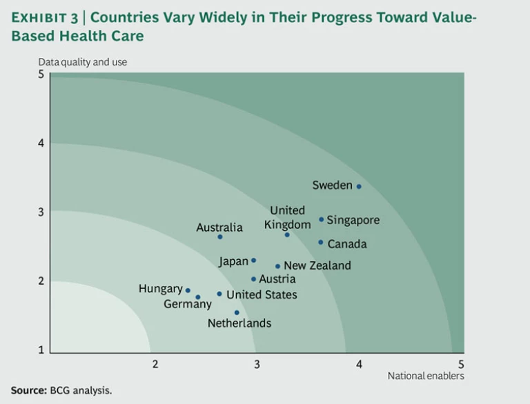 Value-based health care is becoming the focus of many health-care-reform efforts around the world because it promises to be a more effective and more sustainable approach for limiting the increase in health care costs than traditional approaches such as utilization reviews or cost controls. The Boston Consulting Group has recently developed a methodology—a maturity assessment framework—for assessing the progress of a country’s health system in adopting and institutionalizing value-based health care. In 2011, we used this framework to evaluate the health systems of 12 countries: Australia, Austria, Canada, Germany, Hungary, Japan, the Netherlands, New Zealand, Singapore, Sweden, the U.K., and the U.S. (In the course of 2012, we will be adding other countries to the list.)