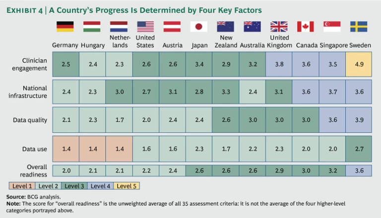 Exhibit 4 displays the average score in the four broad categories that track our success factors, as well as a score for overall readiness, which is the unweighted average of all 35 criteria. In this approach, Germany is at the bottom of the list, owing mainly to limited access to high-quality data and poor data utilization.