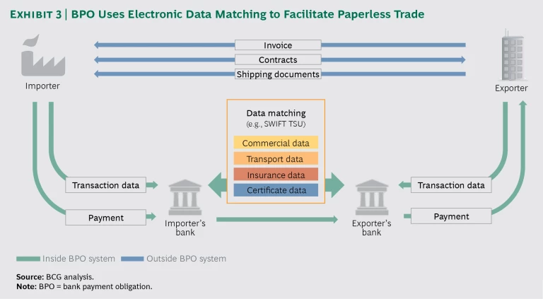 Bank Payment Obligation. BPO uses electronic data matching to facilitate payments between the importer’s bank and the exporter’s bank. It is quicker and usually cheaper for companies than LCs (partly because of a shorter credit utilization period), while still avoiding the settlement risk of open-account trading. (See Exhibit 3.)