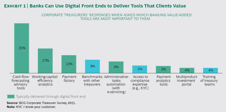 Banks should not underestimate the importance of high-quality digital front ends. (See Exhibit 1.) These interfaces do more than improve customer convenience. By acting as gateways for supplying customers with complementary services over and above mere transactions, they can strengthen relationships in a way that fintechs struggle to achieve. Getting the front end right allows banks to be seen as service partners rather than document processors, thus letting them sustain their fees in the increasingly competitive digital world.