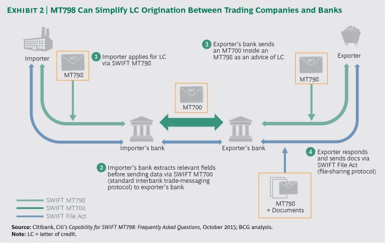 MT798. MT798, the so-called “trade envelope,” is a standardized SWIFT messaging protocol for direct-to-bank origination from within a client’s enterprise-resource-planning system. (See Exhibit 2.) It reduces process complexity and allows companies to buy from multiple banks with ease.