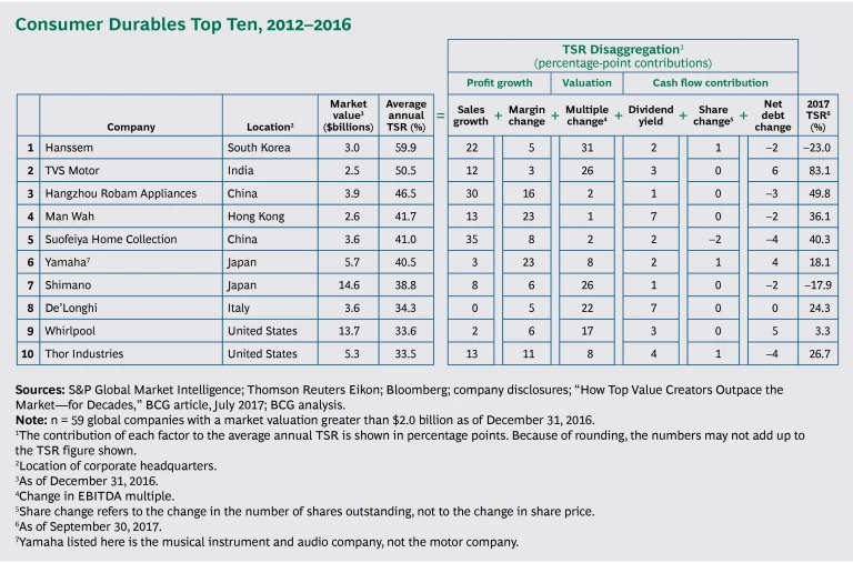 The robust sales growth in the sector is thanks to several encouraging trends during the past five years. Mature economies have stabilized, with a strong recovery in housing starts, sustained retail growth, and historically low interest rates. In the US, for example, housing starts in the third quarter of 2017 were 50% higher than they were five years ago, and existing home sales were 16% higher. This pent-up demand for housing has led to a positive growth environment for durables manufacturing companies such as Whirlpool—which finished ninth over the period of our analysis—as homeowners buy new appliances and renovate their homes after purchase. (See the exhibit for a full list of the top ten, as well as factors contributing to TSR.)