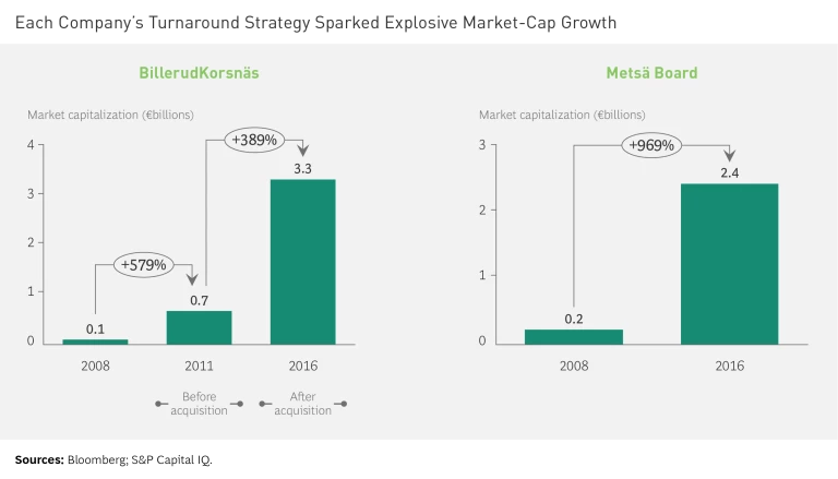 From 2008 (at the beginning of their turnarounds) to 2016, the two companies experienced explosive growth in market capitalization. BillerudKorsnäs’s market cap rose from €0.1 billion to €3.3 billion, while Metsä Board’s jumped from €0.2 billion to €2.4 billion. (See the exhibit.)