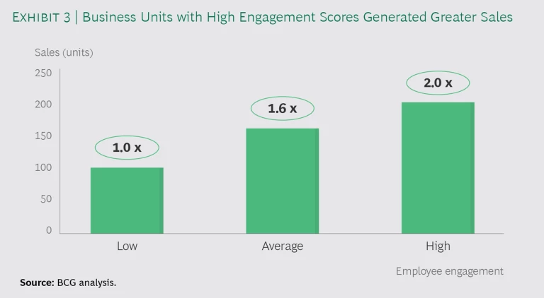 Another company, struggling with high attrition in customer-facing roles, relied on people analytics to show that a more balanced workload could reduce attrition by 15% and improve customer loyalty scores by 7 percentage points. Moreover, increasing employee engagement could improve sales performance by 19%. Business units with high engagement had twice the sales volume, compared with units with low engagement. (See Exhibit 3.)