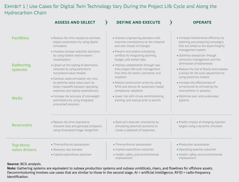 Digital twin use cases can help companies optimize the following value drivers: capital expenditure reduction, time-to-first-oil acceleration, recovery rate increase, production acceleration, operating expense reduction, and health, safety, and environmental improvement. (See Exhibit 1.) In general, digital twin technology enables companies to optimize operating processes and improve capital investments in a virtual world before applying them in the real one.