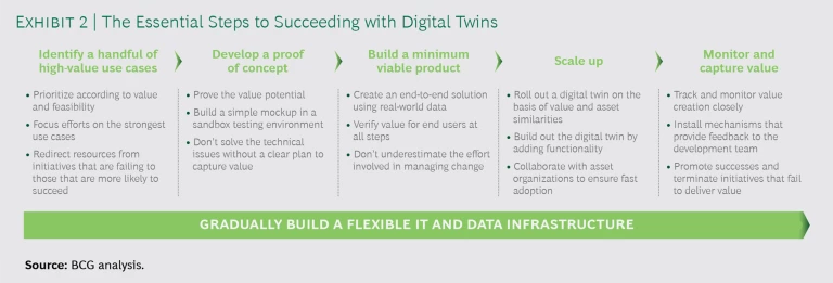 Companies that successfully develop high-value digital twins follow several essential steps. (See Exhibit 2.)