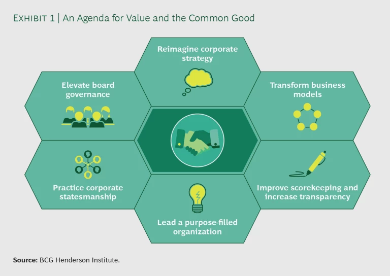 We frame the journey to new corporate value and the common good around six imperatives. It begins with reimagining corporate strategy, then involves transforming the business model, reframing performance and scorekeeping, leading a purpose-filled organization, practicing corporate statesmanship, and elevating governance. (See Exhibit 1.) While challenging to execute, we argue that this agenda will be essential to create a great company, a great stock, a great impact, and a great legacy.
