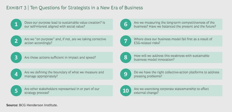 This new type of strategy flips leadership’s perspective from “company-out” to “societal needs-in,” by asking how a specific SDG target could be met by extending the company’s capabilities, assets, products, services, and ecosystem—and those of its industry. Exhibit 3 lists ten questions that strategists should incorporate into their strategy processes to ensure that they embrace the opportunity to create both shareholder returns and societal impact.