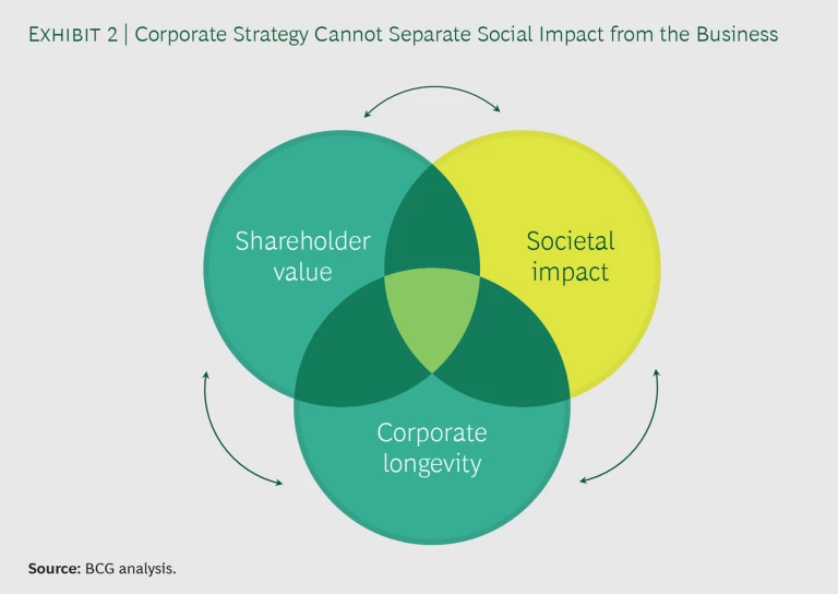 We believe few companies have strategies for this new era of business. Exhibit 2 illustrates the ambition of such a strategy, which establishes competitive advantage at the intersection of shareholder value, corporate longevity, and societal impact. The “quality” of the strategy is thus judged by how it delivers both total shareholder returns and total societal impact.