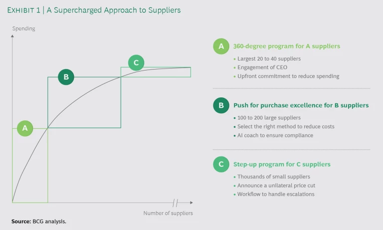 To remedy this problem and see substantial results fast, companies need to rethink all aspects of their engagement with their suppliers. We recommend taking a “supercharged” approach to suppliers, segmenting them into three groups on the basis of their spending. (See Exhibit 1.)