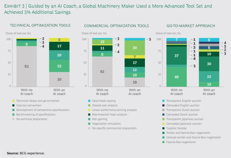 To address this issue, BCG developed the artificial intelligence (AI) “negotiation coach,” a tool that helps procurement employees select the best methods to use with each supplier. The coach begins by asking a series of questions to determine the key characteristics of the purchasing circumstances. Typical concerns include the number of suppliers available, their locations, the variation in their prices, and the extent of spending fragmentation. The coach then identifies the combination of methods that can generate the greatest cost savings. Any number of methods can be deployed in any combination.