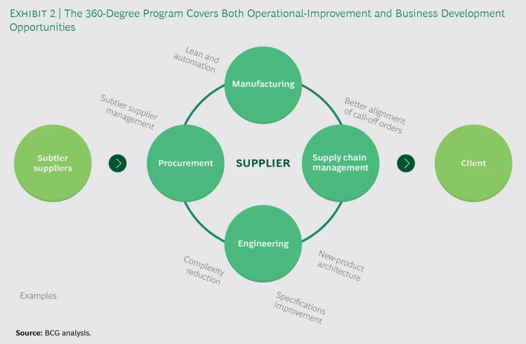 Typically, a dedicated team is responsible for implementing the 360-degree program, and a joint buyer-supplier steering committee monitors it. The steering committee consists of the customer’s product development and procurement executives and the supplier’s key account managers and relevant functional executives, such as factory leaders for manufacturing-improvement initiatives. Once each quarter, the CEOs join the team meeting to keep everyone honest.