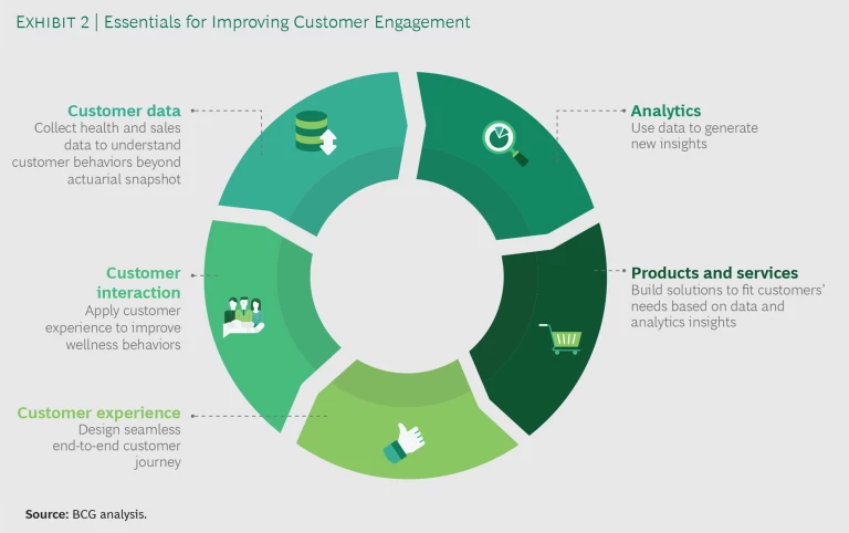 Customer Engagement. In order to create a product or service that their end customers will value, life insurers need to understand those customers better than they do today. This will require a greater focus on end-customer priorities. Exhibit 2 shows the elements of customer engagement. Insurers may start with any one of these activities, depending on their approach to wellness. The activities are mutually reinforcing, and insurers that are serious about the effort will eventually undertake all of them simultaneously.