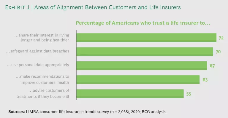 In a survey that BCG and the insurance association LIMRA conducted in February, most US consumers said they would trust the health and wellness suggestions made by life insurance carriers. (See Exhibit 1.) Clearly, life insurers and consumers have a shared interest—increased longevity. This creates an opening for a higher level of engagement through wellness and could allow carriers to form stronger relationships with their end customers.