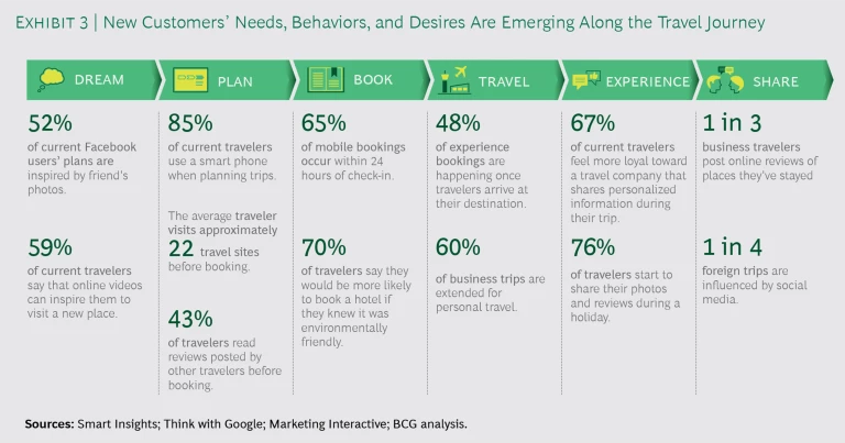For example, travelers increasingly value things like user-generated photos and videos, along with credible reviews that help a potential traveler get inspired for a given trip and verify the quality of an experience or offering. Increasingly, consumers see those kinds of reviews as more trustworthy than traditional marketing. Similarly, the industry has seen a rise in the number of last-minute and in-destination bookings. Exhibit 3 shows additional emerging trends throughout each stage of the customer journey.