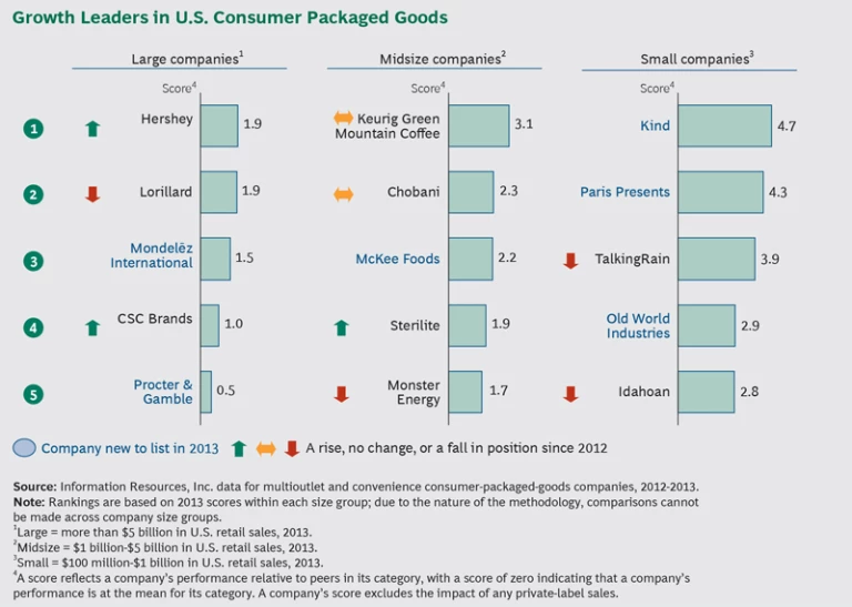 Which companies are leading the pack when it comes to growth in the U.S. consumer packaged goods (CPG) market? For the second year in a row, BCG and Information Resources, Inc. (IRI) have set out to answer that question, ranking more than 400 CPG companies—both public and private—with annual U.S. retail sales greater than $100 million. Among the key findings: while small companies continue to take share from large companies, some top-performing large players are fighting back. The study evaluated each company on three metrics—dollar sales growth, volume sales growth, and market share gains—and then ranked companies based on their performance. Recognizing that manufacturers of different sizes face disparate challenges and opportunities, BCG and IRI grouped companies into three categories on the basis of sales: small ($100 million to $1 billion in IRI-measured retail sales), midsize ($1 billion to $5 billion), and large (more than $5 billion). A company’s score reflects how well it performed on those three metrics relative to its peer group. A score of zero indicates performance in line with the overall industry within a given size group, while a positive score reflects outperformance.