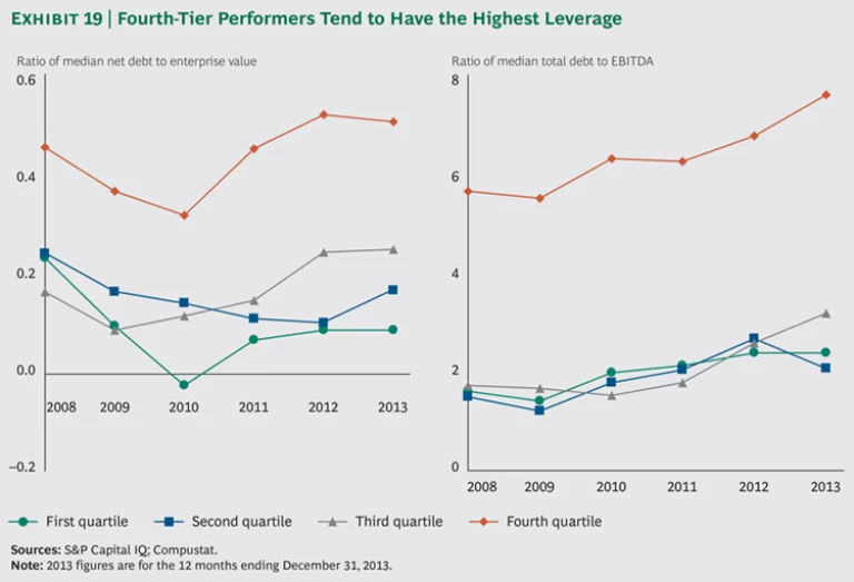 ECS executives know better than most that business fortunes can reverse virtually overnight. The best protection against unforeseen market shocks is a solid balance sheet with modest debt levels and a strong credit rating. By the same token, high debt ratios and weak balance sheets are the mark of the lowest-performing and most vulnerable ECS companies. (See Exhibit 19.)