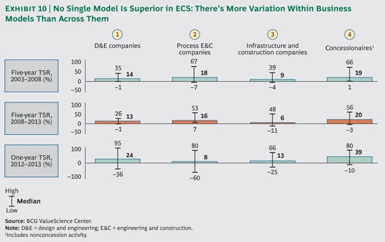 Grouping companies by business model, we found distinct differences in their performance during the past five years. (See Exhibits 10 and 11.) The concessionaire category includes companies that turned in some of the best five-year average TSRs as well as some of the worst, yet overall, concessionaires generated the strongest five-year TSR performance—a marked change from 2003 through 2008, when process companies routinely turned in the highest TSRs. D&E companies tended to cluster in the middle of the TSR range and, as a group, turned in the least volatile performance from 2008 through 2013. Process companies have enjoyed a strong five-year run thanks to the boom in commodities (that is, raw materials extracted from the ground), but their returns moderated somewhat in 2013 as commodity prices began to ease. TSRs of infrastructure and construction companies were generally near the bottom of the range, reflecting the sharp slowdown in government and commercial contracting that followed the financial crisis.