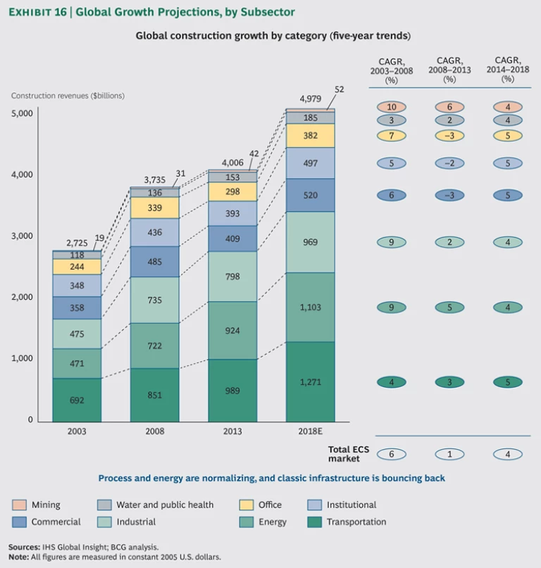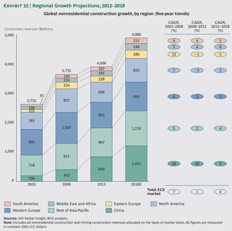 The further the early years of this millennium recede into the past, the more they seem like a vanished era of unlimited possibility for the engineering, construction, and services (ECS) industry. Today, six years after financial crisis rocked the global economy and forced a recalibration of business strategies, the ECS industry operates in a far different world in which constraints abound. These include tightening margins, intensifying competition, rising labor costs, and continued pressure from the capital markets to create value. The next five years, however, look brighter. The ECS industry can expect a return to growth, especially in mature markets that have encountered strong headwinds since 2008.