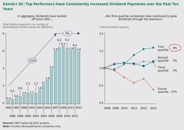 In today’s more cautious environment, the financial markets view dividends as the price of entry to the top corporate ranks. As tempting as it might be to reinvest all free cash flow into continued growth, investors consider dividends a leading indicator of corporate health, and they will not support large mature-market companies that hoard cash instead of returning it to shareholders. (See Exhibit 20.)