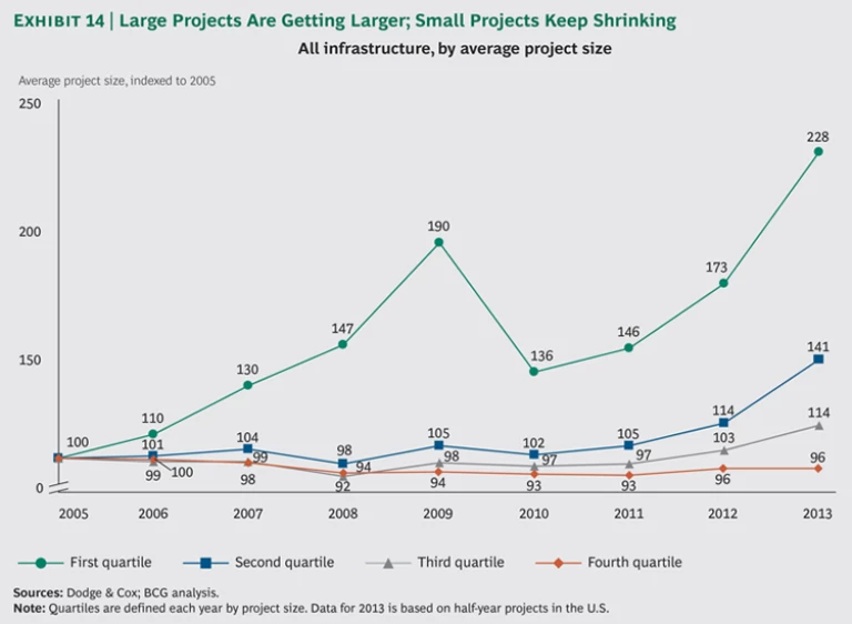 In mature markets, at least, size still matters. Big projects continue to get bigger, and only large-scale companies are credible bidders for such ambitious undertakings. (See Exhibit 14.)