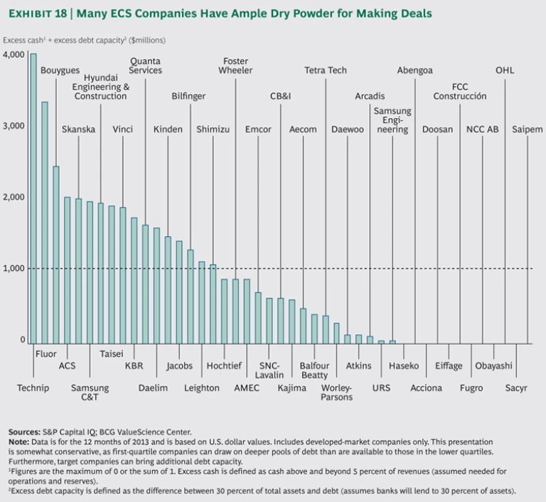 The largest companies in developed markets still have ample financial resources—in terms of both retained cash and borrowing power—to commit to acquisitions. (See Exhibit 18.) We identified 19 companies with at least $1 billion in “dry powder” on hand as of the end of 2013. That’s quite a reservoir, considering that most deals in the ECS space are relatively small “tuck-ins” focused on adding capabilities or footholds in new markets. In addition, by tapping the target’s borrowing capacity and using creative deal structures, acquirers can, in many cases, go well beyond their stated dry-powder figures for the right deal. It’s therefore likely that the ECS industry will remain very active in M&A, and inorganic growth will remain a critical pathway to sustained TSR performance.