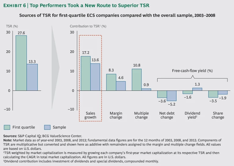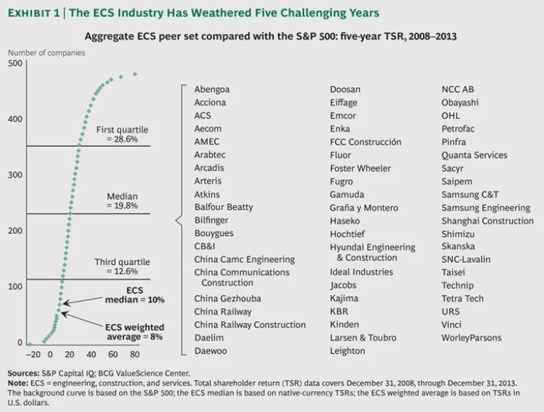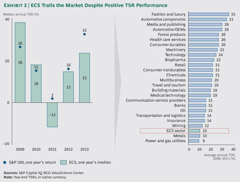 The pressures on ECS can be seen in the market performance of our 60 peer companies over the past five years from the end of 2008 through the end of 2013. (See Exhibit 1.) The sector’s weighted-average annual total shareholder return (TSR) during that period was only 8 percent, well below the TSR of roughly 18 percent posted by the S&P 500. In other words, the ECS companies in our sample were, in the aggregate, fourth-quartile performers.