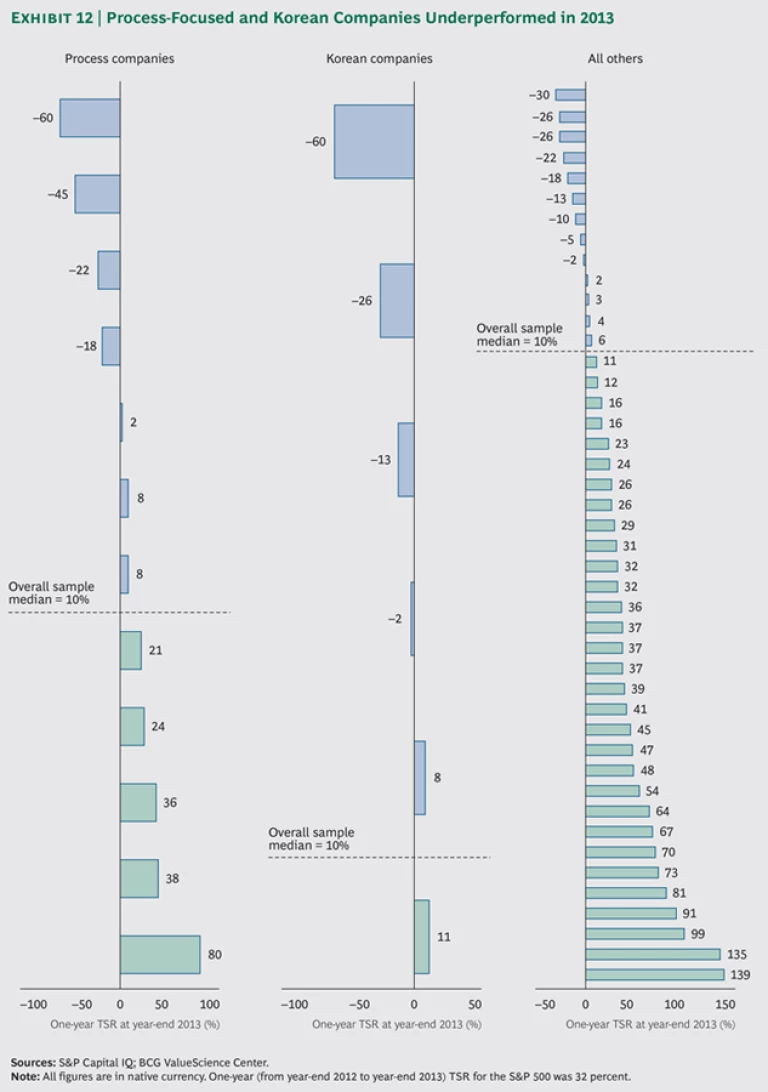 Observations of 2013 results suggest that in the coming years, the ECS industry may undergo another reshuffling of the ranks. Many strong performers during the past five years experienced significant TSR declines in 2013, especially process-focused companies and companies based in South Korea. (See Exhibit 12.) Median TSRs of process companies fell to 8 percent in 2013, half their five-year returns. However, the median encompasses a wide range of individual company performance. Concessionaires, on the other hand, enjoyed a strong TSR resurgence in 2013 after a long period of comparative underperformance.