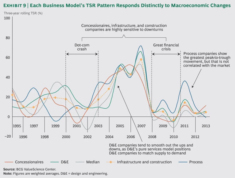 The business models respond differently to changes in the macroeconomic environment. (See Exhibit 9.) Concessionaires are highly sensitive to GDP growth trends because they often take traffic and volume risks associated with user demand for assets. D&E companies are less capital-intensive and, in many cases, have consultancy businesses that are less sensitive to economic swings than other models. Therefore, their performance tends to be less volatile over time. Infrastructure construction companies are highly capital-intensive and thus have heightened sensi-tivity to both government infrastructure spending and payment slowdowns during economic contractions, which impair their working capital. Process E&C companies tend to be the most volatile, because their business fluctuates with commodity prices and the mineral capital-expenditure cycle, which has more pronounced peaks and valleys than GDP.
