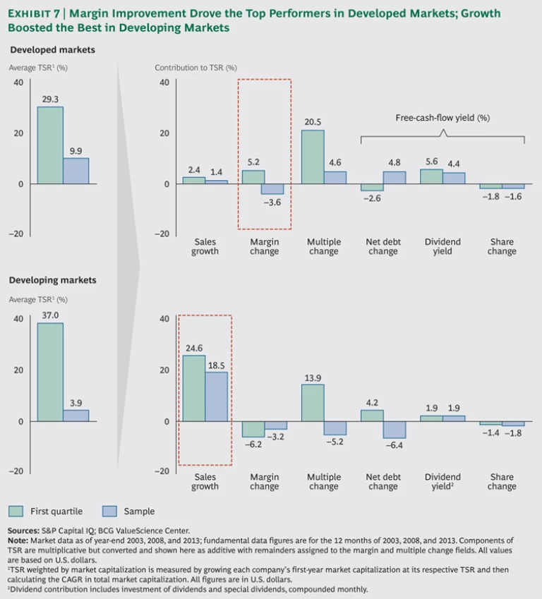 Total shareholder return, which accounts for share price development in a given time period (dividend payouts are also part of the calculation), is the product of several factors. Readers of BCG’s Value Creators series are likely familiar with our methodology for quantifying the relative contribution of the various sources of TSR. The methodology uses the combination of revenue (that is, sales) growth and change in margins as an indicator of a company’s improvement in fundamental value. It then uses the change in the company’s valuation multiple to determine the impact of investor expectations for TSR. Together, these two factors determine the change in a company’s market capitalization. Finally, the model also tracks the distribution of free cash flow to investors and debt holders in the form of dividends, share repurchases, and repayments of debt in order to determine the contribution of free-cash-flow payouts to a company’s TSR.