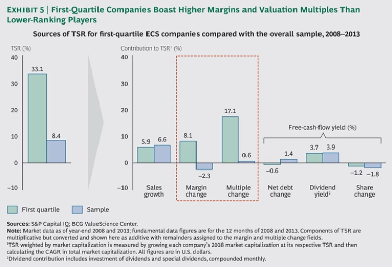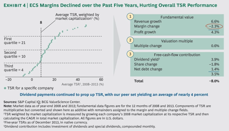 What hurt ECS companies most was the decline in margins that many—though not all—suffered over the past five years. (See Exhibit 4.) Average margins—eroded by rising labor costs that outstripped modest revenue growth—declined by about 2 percent annually, intensifying global competition for the addressable market and supply-demand imbalances that held price increases in check. As a result, compressed margins offset much of the benefit of sales growth in TSR terms. (To calculate the total contribution of profit growth to TSR, add the revenue growth rate to the margin change rate.) Fortunately, slight multiple increases and strong dividend yields of nearly 4 percent propped up TSRs somewhat. (See “How We Measure Value Creation: The Components of TSR.”)