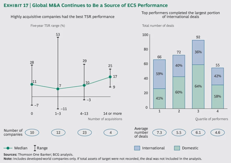 ECS M&A data from the past five years shows that serial acquirers (those that completed at least 14 deals over the five-year period) delivered the highest TSR: the median was 17 percent, but it ranged from 9 to 25 percent. (See Exhibit 17.) Bilfinger, Fugro, and Vinci were among the most active dealmakers, and each landed among the first or second quartile in terms of TSR performance. Meantime, first-quartile performers completed the greatest number of international deals: nearly 60 percent of targets were based in countries other than the home of the first-quartile company. Among first-quartile performers, AMEC, Arcadis, and Bilfinger were the most active dealmakers, each conducting about ten such transactions, according to data from Thomson One Banker.