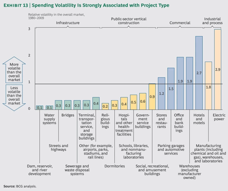 In addition, the imperfect correlation of returns across business models suggests that the best-run businesses will seek to optimize the shape and balance of the business models and regions in their overall portfolios in order to optimize growth and human capital development in all economic cycles. Whereas infrastructure and public-sector spending are generally stable across cycles, commercial spending—especially for industrial and process projects—is much more volatile. (See Exhibit 13.) The ability to harness this dynamic—tapping into strong returns from volatile sectors while mitigating the risk of being “all in” on any of them—can be a source of superior returns over time. Furthermore, idle capacity is particularly negative in human-capital-intensive businesses in which engineers need to work on projects in order to develop professionally and build their résumés. The ability to flex resources across business models and markets as cycles change is a critical success factor for many market-leading companies.