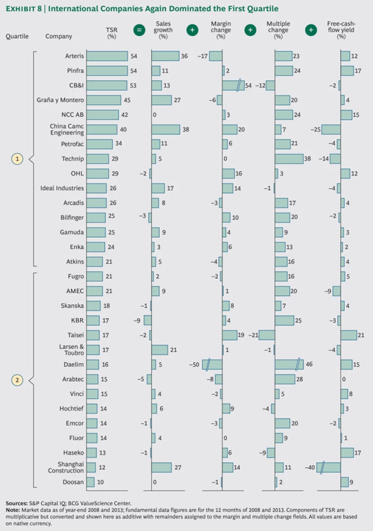 Companies focused on developing markets, particularly with concessionaire business models that promise steady cash flows well into future years, are still evaluated primarily on the basis of their growth potential. But the days of big E&C companies simply hiring and outgrowing their cost issues appear to be over. The absence of large, established developed-world companies such as KBR and Fluor from the first quartile underscores that point. (See Exhibit 8.)