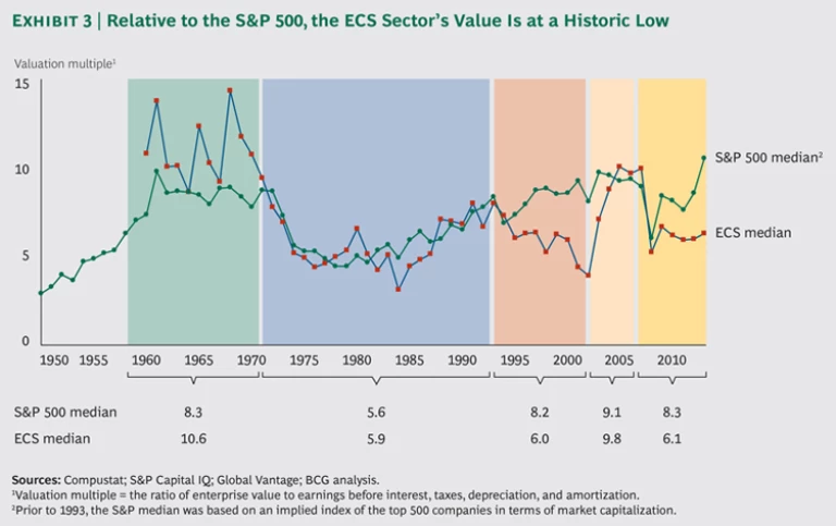 The sector’s decline can also be seen in relative valuation multiples, measured as the ratio of enterprise value to earnings before interest, taxes, depreciation, and amortization. (See Exhibit 3.) Although S&P multiples have risen steeply over the past five years, reflecting the market’s renewed confidence that companies can sustain profit increases in the wake of the financial crisis, ECS multiples have stayed relatively flat. By our calculations, only once in history, in 2001, has the gap between S&P and ECS multiples been so wide. At that time, ECS was ahead of the broader market, which was reacting to a sharp decline in capital spending in response to both a recession and a major security event.