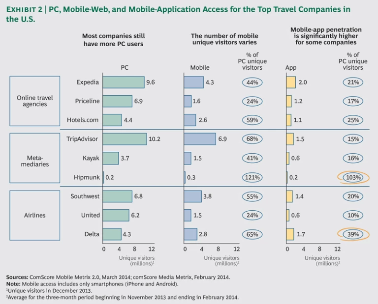 This dynamic creates a completely new battleground for the travel industry. Travel companies vary widely in how well they have replicated their success on the Web in the mobile environment. (See Exhibit 2.) For example, Delta Air Lines has fewer unique visitors on the Web than its major competitors, but almost 40 percent of them use its mobile app, which puts it in the lead in terms of mobile success—at least for the moment.