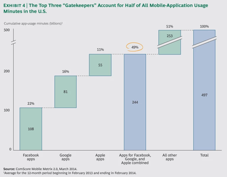 This universe is still evolving, but the biggest gatekeepers today are the device manufacturers and the companies behind the main mobile-operating systems and app stores, app-to-app marketers, and social networks and messaging app operators. The top three players currently account for half of total app usage. (See Exhibit 4.) Gatekeepers of the future may include gaming companies (people use gaming apps for 32 percent of the time they spend on mobile devices, according to Flurry) and entertainment apps, such as YouTube. Since this segment is in flux—and, with a few exceptions, it is impossible to know who the ultimate winners will be (much like the rest of the mobile ecosystem)—travel companies will want to experiment and place multiple bets.