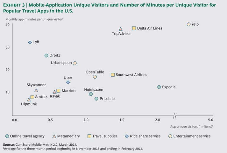 On mobile platforms, however, the king must yield his throne. According to mobile-analytics firm Flurry, the average U.S. consumer spends two hours and 42 minutes per day on his or her mobile devices, using apps for 86 percent of that time. Data from comScore shows that the amount of time spent on the apps of the top five travel companies (as opposed to visiting their websites) jumped to 48 percent in February 2014 from 38 percent in February 2013—an increase of 26 percent. TripAdvisor’s mobile app has been downloaded 100 million times; Expedia’s app, more than 25 million times in more than 220 countries and territories. Mobile usage accounted for almost two-thirds of searches and almost half of local ad revenues at Yelp in the third quarter of 2013.