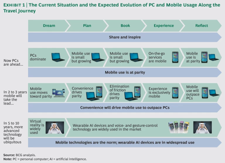 All that said, our research indicates that while most travel companies recognize the rapid ascent of mobile, they have yet to develop a full understanding of its reach and impact. Mobile rearranges the relationship between a travel company and its customers, much the way the original wave of digital disruption did, scrambling established patterns of behavior in different phases of the travel journey. (See Exhibit 1.) The mobile experience is a whole new universe of connectivity that’s local (it’s always where you are), personal (tailored to your needs and preferences), and social (all your friends are there as well). And it’s always on. For companies, the opportunity to build brand and relationships, drive incremental purchase opportunities, and add to the overall service offering is enormous. But the dynamics of interaction on a mobile device are very different from those on a desktop. Companies cannot approach mobile users as if they were simply carrying a PC in their pocket.