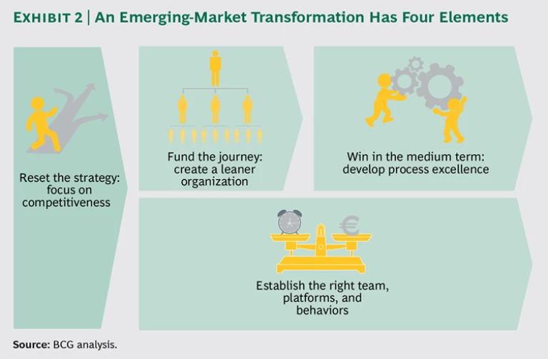 Many MNCs will have to undertake a process of transformation in emerging markets. As we have written before, transformations are not just for troubled companies; they have become necessary interventions in many, if not most, corporations. Less than half of BCG clients that have undergone a transformation effort over the past decade had been chronic underperformers, and nearly one-quarter had been consistently ahead of their competitors.