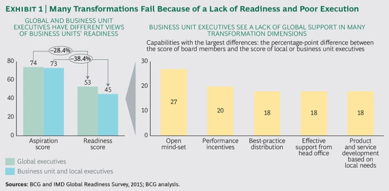 The risk of failure in transformations in emerging markets is even greater. As we observed recently, only about 10% of companies believe they have the full complement of capabilities required to win overseas. Most think they are barely mastering the basics. Moreover, while many companies get their broad globalization strategies right, they come up short on execution in individual markets. Issues related to execution were where our research found the biggest gaps between leaders and laggards. (See Exhibit 1.)