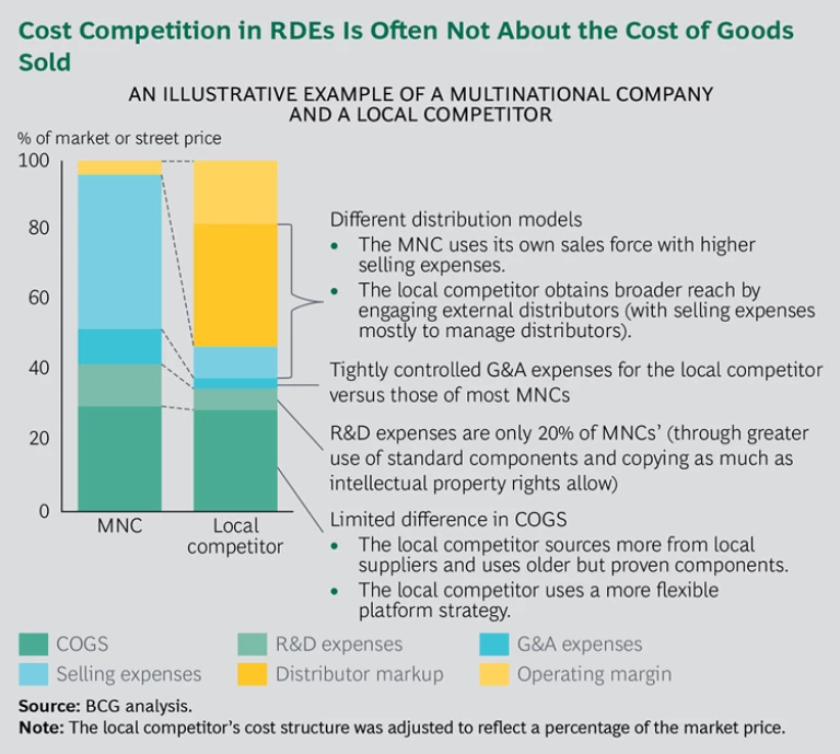 As growth slows and competition increases, it becomes more important for MNCs to understand the commercial environment. MNCs face very different competitive economics than their local counterparts. Product development costs can be much lower, but sales and distribution costs are high. Companies need to adjust their bases of comparison and adopt new or revised KPIs. Our analysis indicates that while a local company and an MNC might have similar costs of goods sold, the local company’s selling expenses are often 10% or less of a product’s retail price, while the MNC’s selling expenses can easily rise to 45%. Higher distribution costs must be offset with aggressive cost savings across other parts of the value chain. (See the exhibit “Cost Competition in RDEs Is Often Not About the Cost of Goods Sold.”)