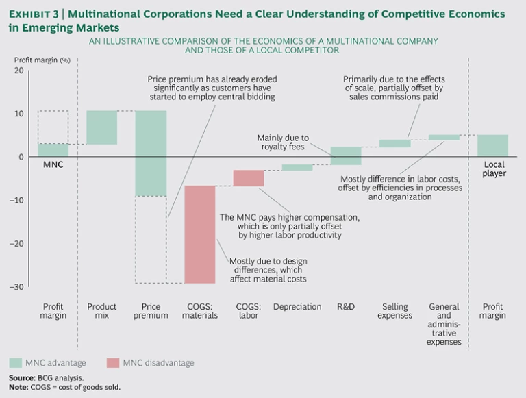 For example, some MNCs undertake regular market-by-market analyses of their economics versus those of their local competitors in order to truly understand where their own advantages—and disadvantages—lie. (See Exhibit 3.) These companies have often found that their costs of goods are at least 20% higher than those of their principal local competitors because of product design and material costs. Their compensation costs are also higher because higher pay packages are only partially offset by higher labor productivity. The companies use these insights as the basis for restructuring their local activities to address competitive weaknesses.