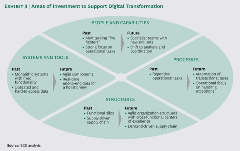 A study by The Boston Consulting Group shows that the leaders in digital supply chain management are enjoying increases in product availability of up to 10 percentage points, more than 25% faster response times to changes in market demand, and 30% better realization of working-capital reductions, on average, than the laggards. They have 40% to 110% higher operating margins and 17% to 64% fewer cash conversion days. With the help of three key strategies, these agile companies are quickly leaving behind their less nimble competitors.