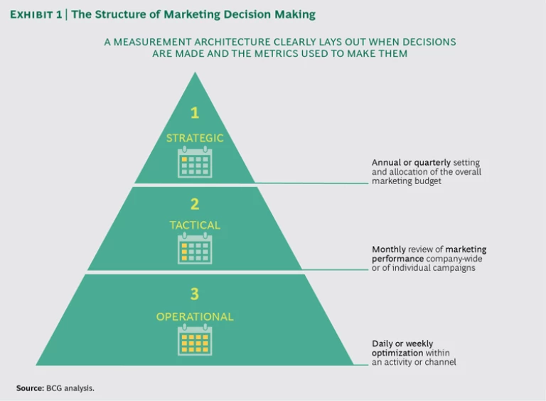 A measurement architecture provides marketers with a framework that defeats the tyranny of random facts by laying out which marketing decisions should be made at which time, based on which metrics, and fed by which tools and data. Once such an architecture is established, it becomes relatively straightforward to develop the analytical infrastructure to bring it to life across the entire organization. We find that many of our clients are increasingly able to focus on how to use software platforms to put data, tools, and insights into the hands of marketing decision makers at each level of the measurement architecture across brands and markets around the world.